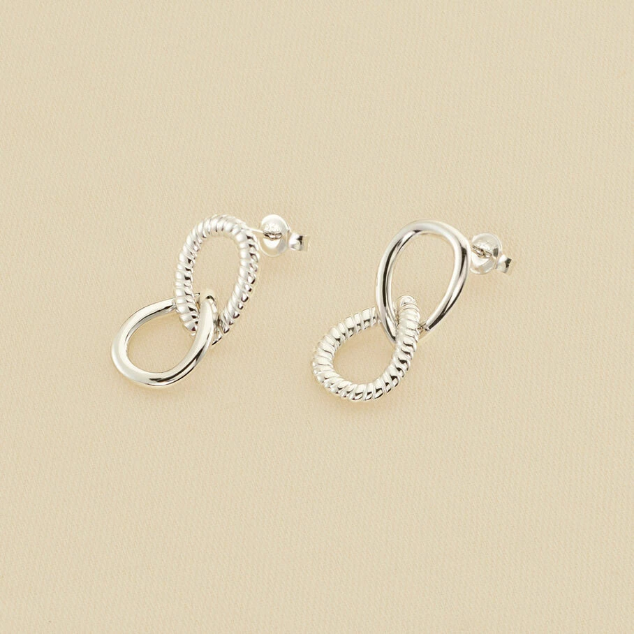 Boucles d’oreilles mi-longues, en argent véritable, constituées de deux gouttes entrelacées dont l’une est torsadée et l’autre lisse