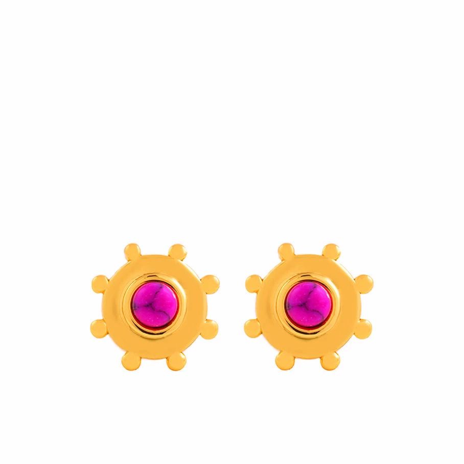 Boucles d’oreilles puces en laiton doré 750/1000, motif ‘soleil’ orné de cabochons de pierres fines
