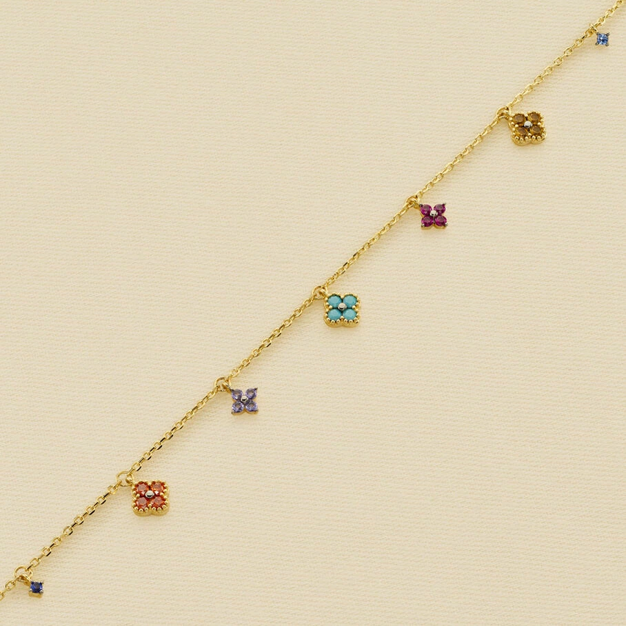 Bracelet chaine, en argent véritable doré 750/1000, avec des fleurs d’oxydes de zirconium en pampille et un fin graineti sur le pourtour