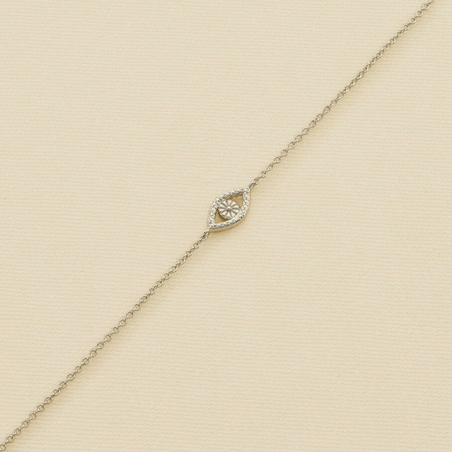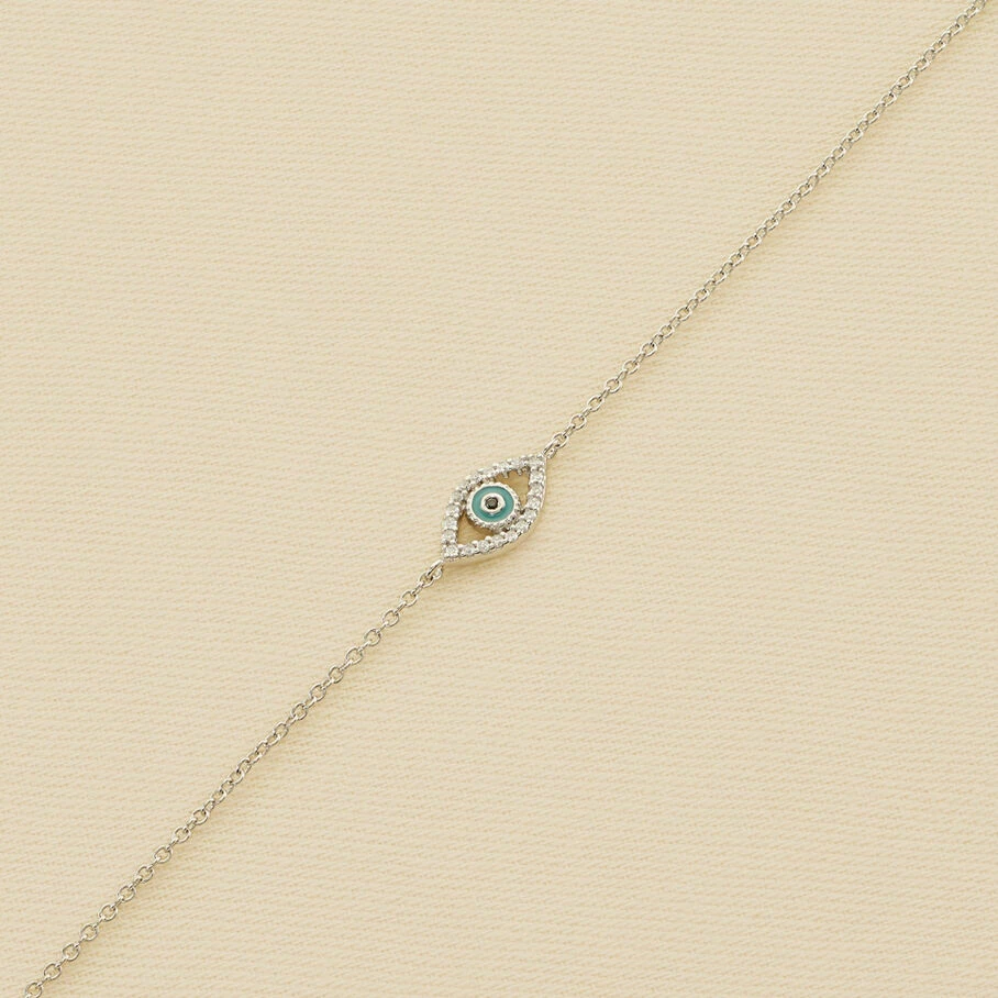 Bracelet, en argent véritable 925/1000, dont la chaine est ornée d’un petit œil turc. L’iris émaillé et le contour de l’œil serti d’oxydes de zirconium apportent un vrai raffinement et éclat au produit!