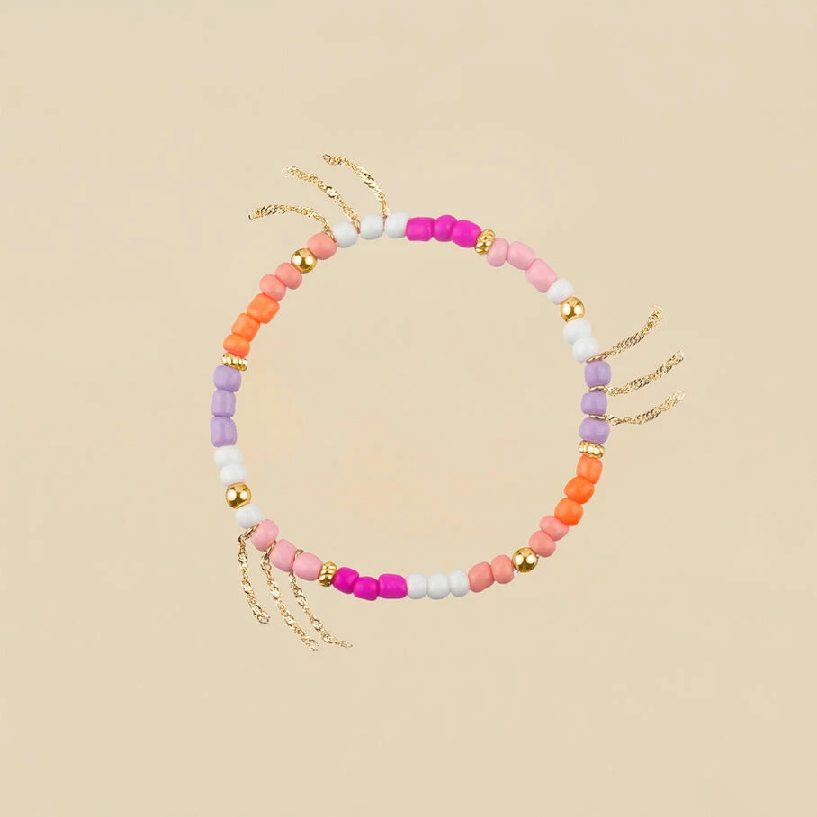 Bracelet elastique, en laiton doré 750/1000, perles de verre enfilées et pompons de chaines