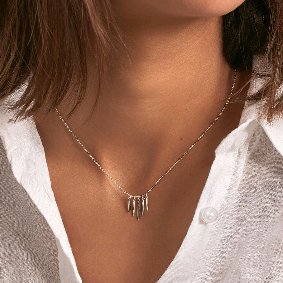 Collier mi-long, en argent véritable 925/1000, avec, en pendentif, un rideau de pampilles rayonnantes.