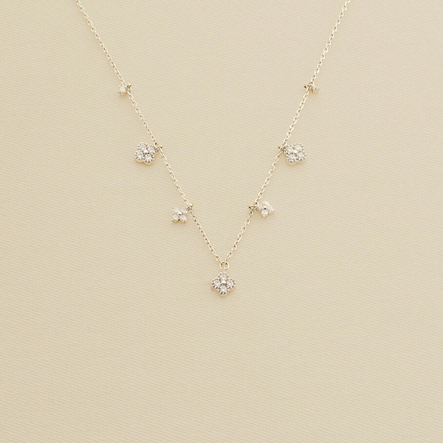 Collier court, en argent véritable, avec des fleurs d’oxydes de zirconium en pampille et un fin graineti sur le pourtour