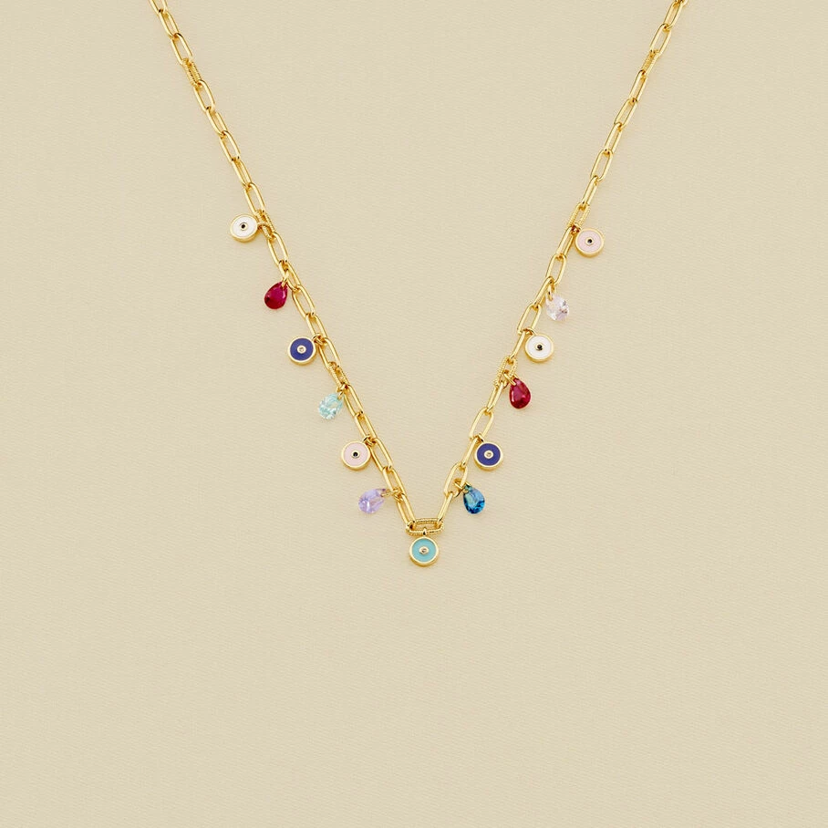 Choker, en laiton doré à l’or fin, avec des perles d’oeils turcs plats et des oxydes percés en pampilles sur chaine rectangle