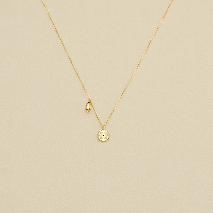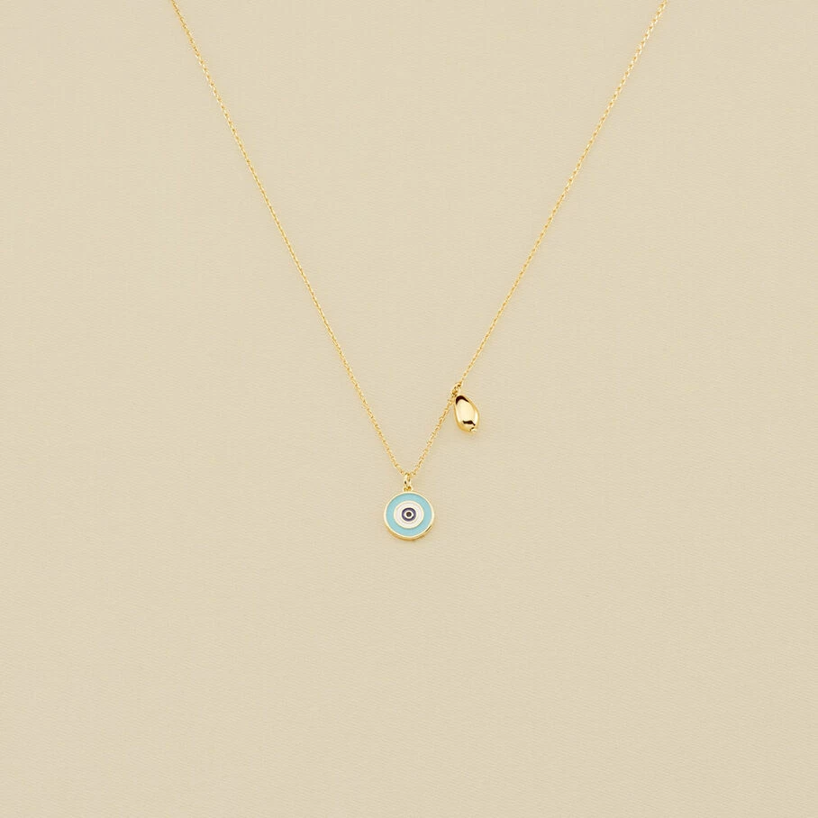 Collier court, en laiton doré à l’or fin, avec un œil turc et un coquillage sur chaine en pendentifs