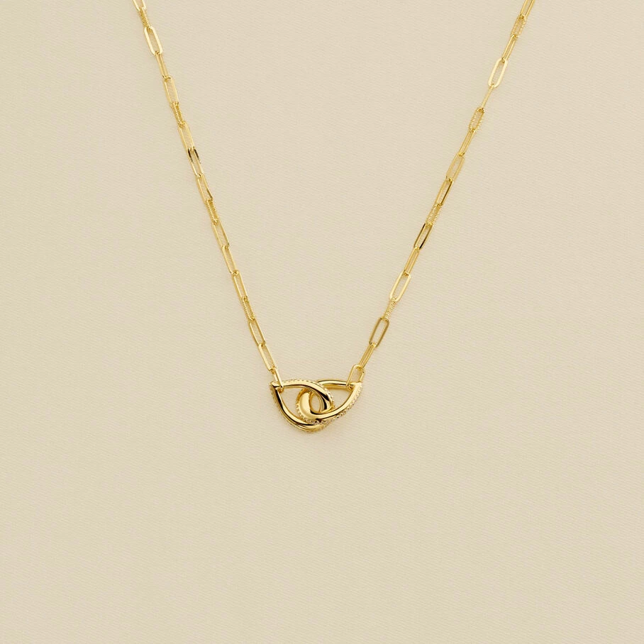 Collier, chaine maille rectangle, en argent 925/1000 et doré 750/1000, dont le prendentif représente deux gouttes entrelacées et serties d’oxydes de zirconium sur la tranche extérieure