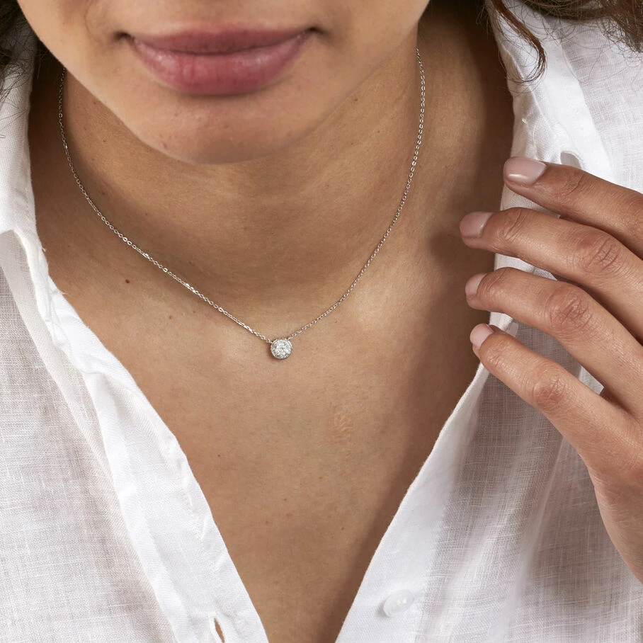 Collier court sur chaine, en argent véritable, avec un mini oxyde rond autour duquel sont micro sertis des oxydes de zirconium