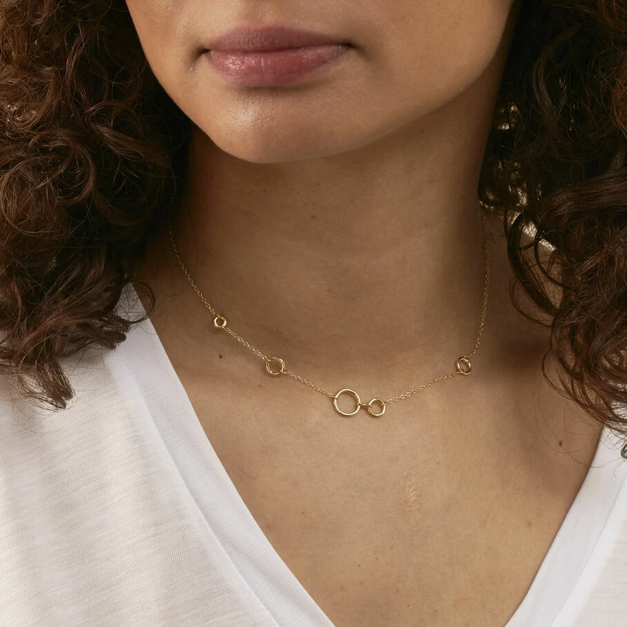 Collier court, en argent véritable doré 750/1000, avec une fine chaîne sur laquelle sont montés des anneaux évidés de différentes tailles