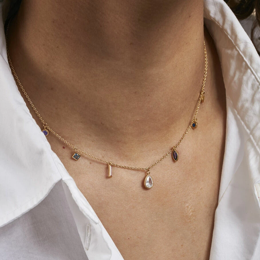 Collier court en laiton doré 750/1000 avec des oxydes de zirconium de différentes formes en pampilles
