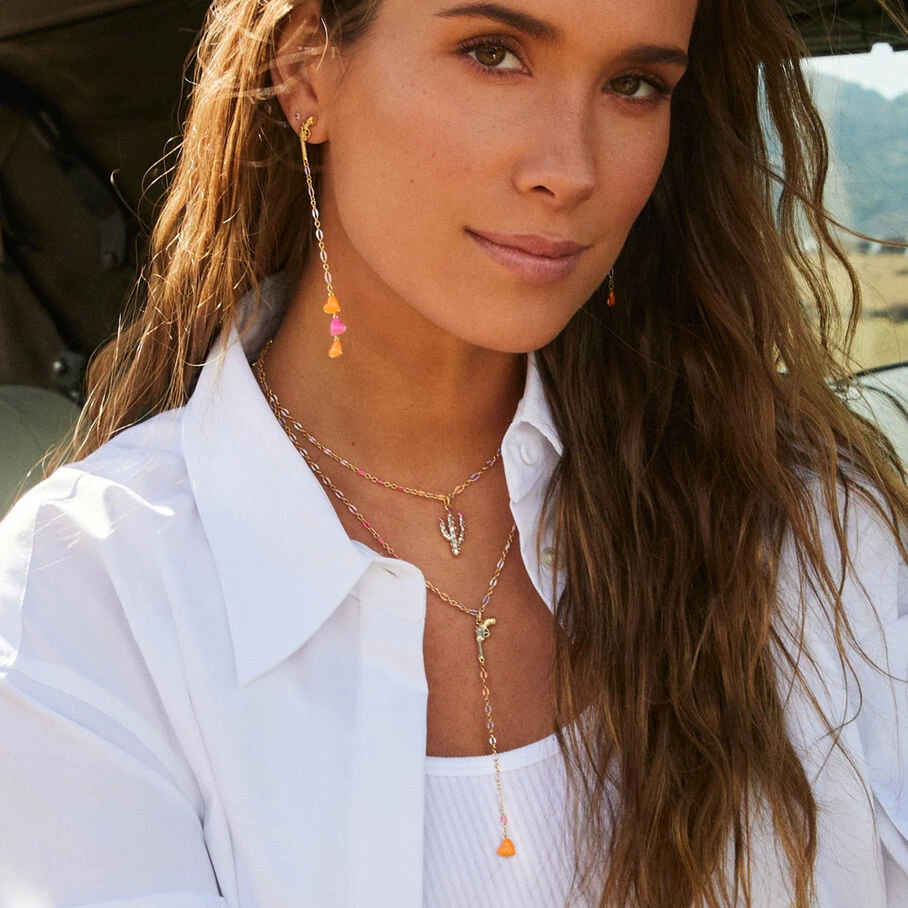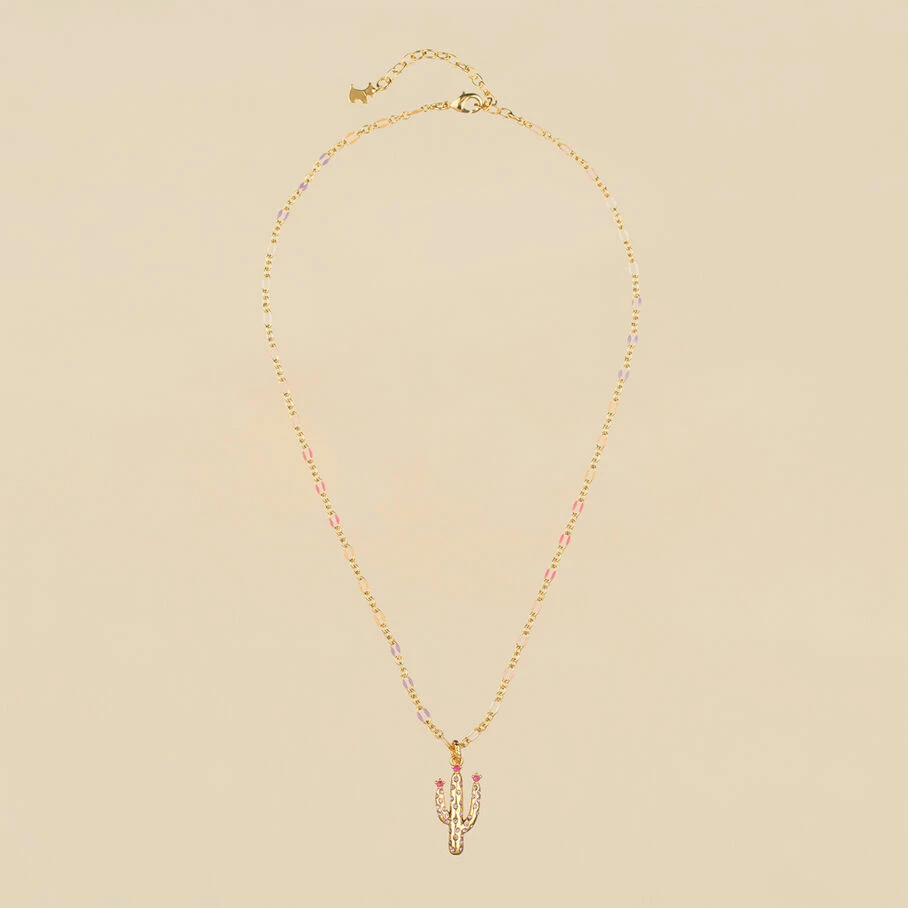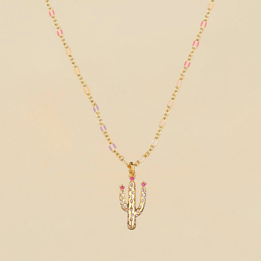 Collier court, en laiton doré 750/1000, chaine émaillée et cactus en pendentif avec 3 oxydes de zirconium