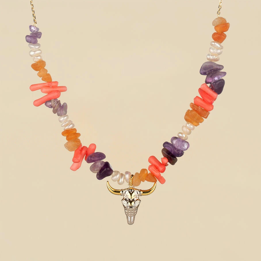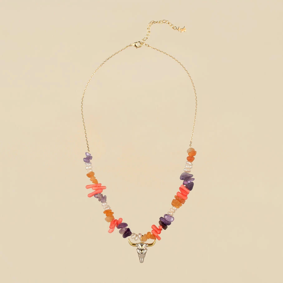 Collier court, en laiton doré 750/1000, section de pierres fines et tête de buffle en pendentif