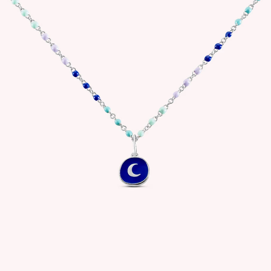 Collier court, en laiton rhodiĂ©, perles d’Ă©mail sur toute la longueur et mĂ©daille double face en pendentif