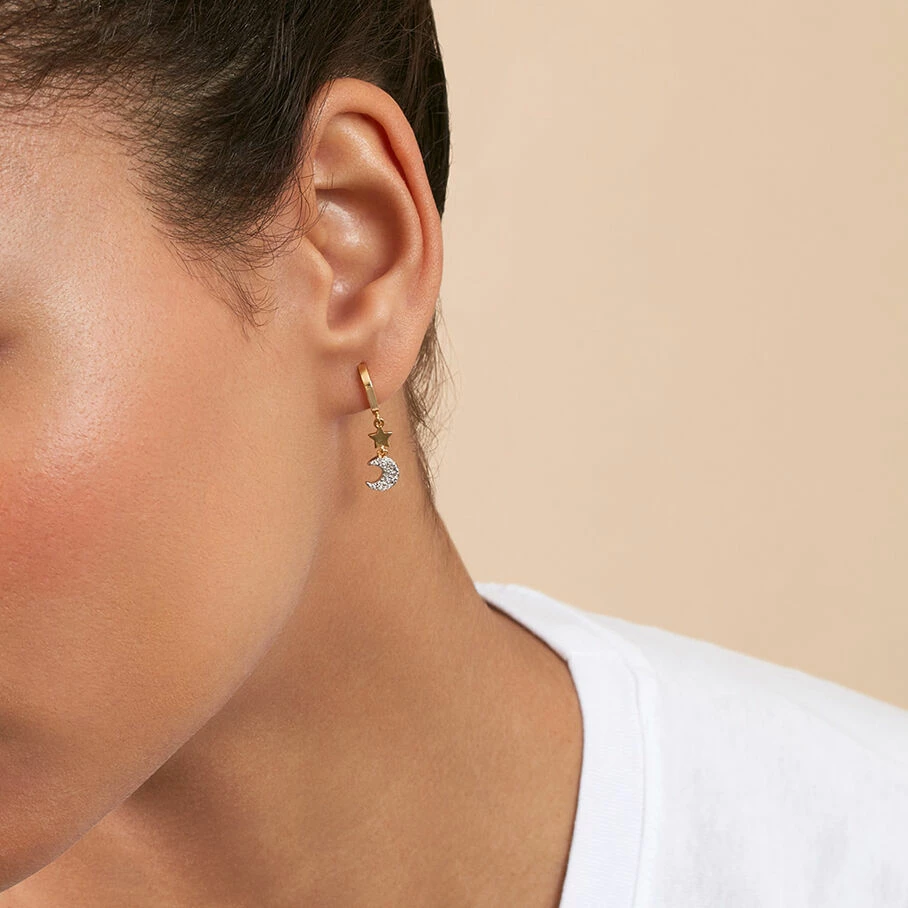 Créoles, en argent véritable doré 750/1000, avec une lune et une étoile en pendentif