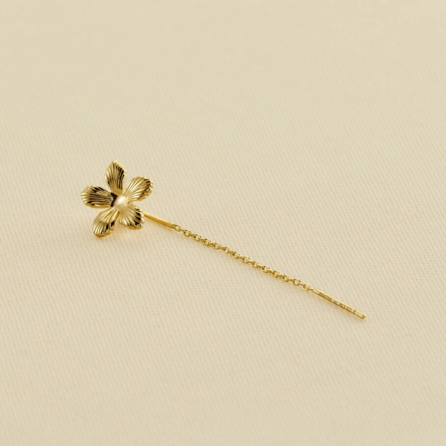 Boucle d’oreille pull trough, fleur sur le devant et chaine longue à l’arrière de l’oreille, en argent doré 750/1000. A l’unité, pour mieux les mixer et les accumuler.