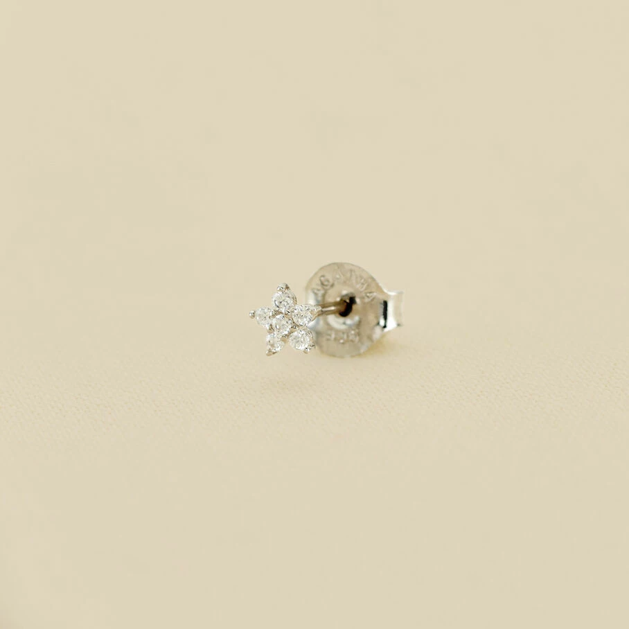 Boucle d’oreille puce en argent véritable en forme de fleur pavée d’oxydes de zirconium. A l’unité, pour mieux les mixer et les accumuler.