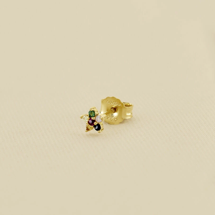 Boucle d’oreille puce en argent véritable doré 750/1000 en forme de petite fleur pavée d’oxydes de zirconium. A l’unité, pour mieux les mixer et les accumuler.