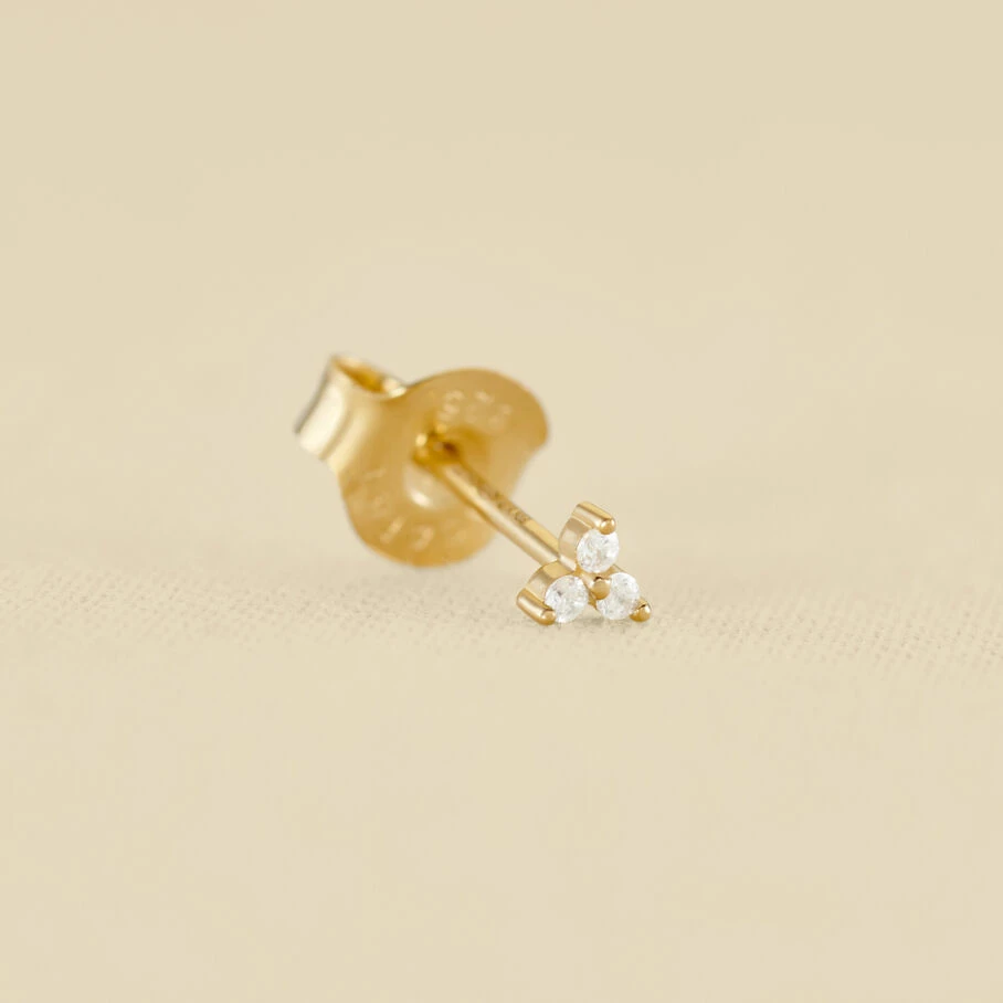 Boucle d’oreille puce en argent véritable doré 750/1000 ornée de trois oxydes de zirconium en triangle. A l’unité, pour mieux les mixer et les accumuler.