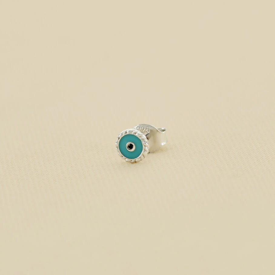 Boucle d’oreille puce à l’unité, en argent véritable 925/1000, en forme d’œil turc. L’iris émaillé et le contour de l’œil serti d’oxydes de zirconium apportent un vrai raffinement et éclat au produit!