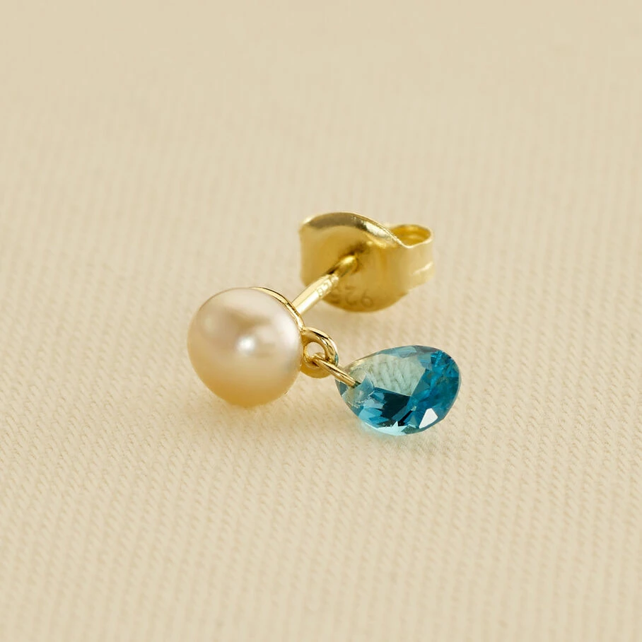 Boucle d’oreille puce à l’unité, en argent 925/1000 doré 750/1000, ornée d’une perle naturelle. La pampille en oxyde de zirconium coloré apporte de la brillance à cette pièce.