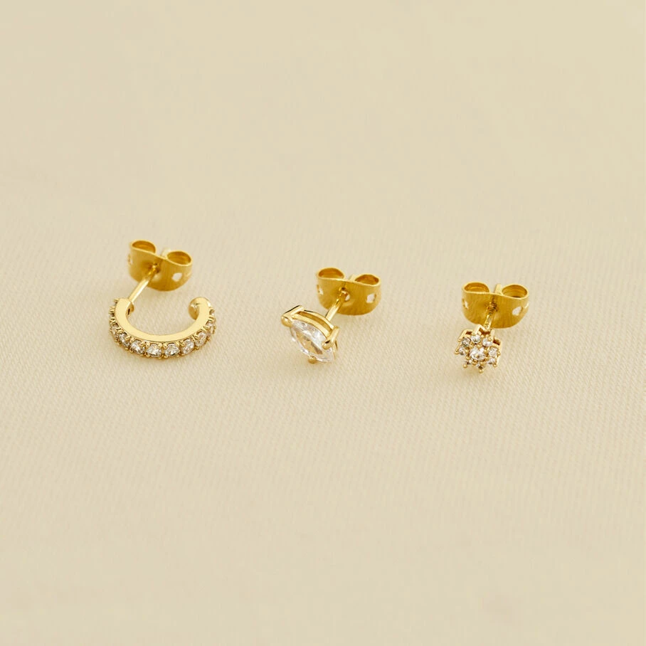 Set de 3 boucles d’oreilles, une crolee t une fleur pavées d’oxydes de zirconium et un oxyde de zirconium de forme navette, en argent doré 750/1000. A l’unité pour mieux les mixer et les accumuler.