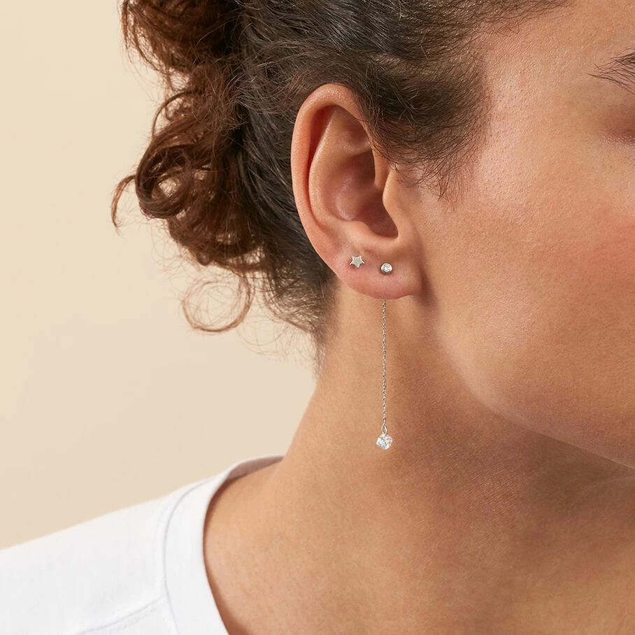 Boucle d’oreille puce boule et chaine accrochée au papillon avec un oxyde de zirconium en forme de coussin percé au bout de la chaine, en argent véritable. Vendu à l’unité pour mieux les mixer et les accumuler
