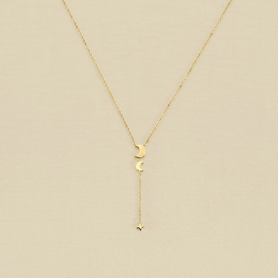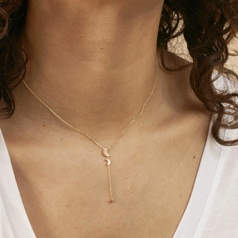 Collier Y, en argent doré 750/1000, dont les pendentifs, sur une fine chaine maille forçat, représentent le cycle lunaire